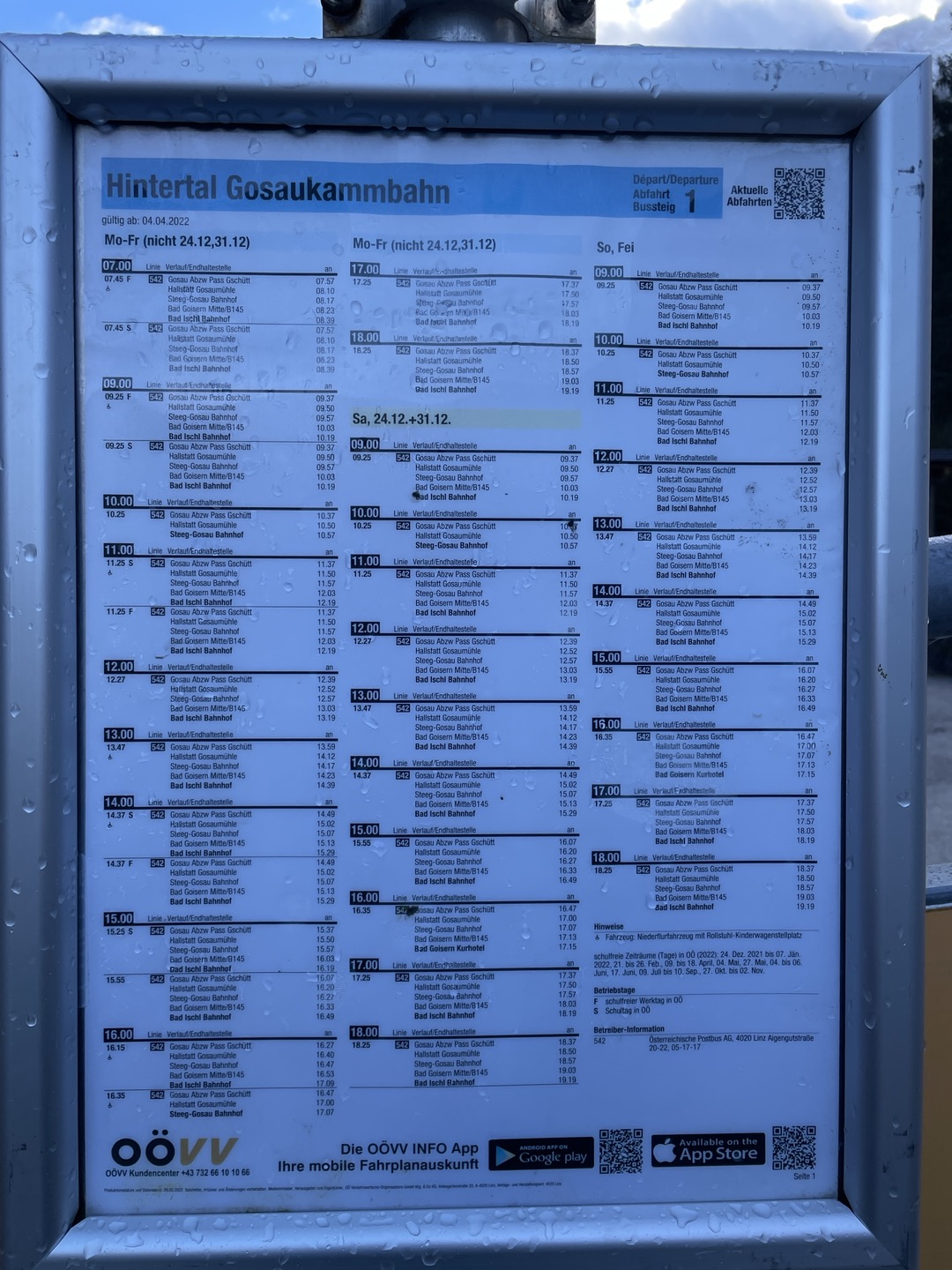 *겨울 시즌 현재 542번 버스가 Hintertal b.Gosau Gosaukammbahn까지 가지 않고 전역인 Hintertal b.Gosau Zwieselalmbahn까지만 운행하여 고사우 호수를 가려면 전역에서 내려서 걸어서 걸어올라가야 하고 30분 정도 소요된다고 합니다. Hintertal b.Gosau Gosaukammbahn까지 가는 버스는 OBB 어플을 통해 확인해본 결과 4월 10일부터 재개되는 것으로 나오고 있습니다. > 다시 운행이 재게 되었습니다!
