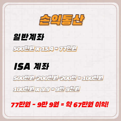 일반 계좌: 500만 원 이익 전부에 대해 15.4% 세금 부과 = 77만 원 세금 부과